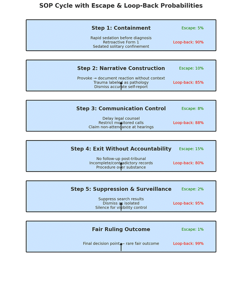 ● Narrative Construction: Escape ~15%; Loop-back ~70% (provoked reaction reframed as instability → renewed sedation/solitary).